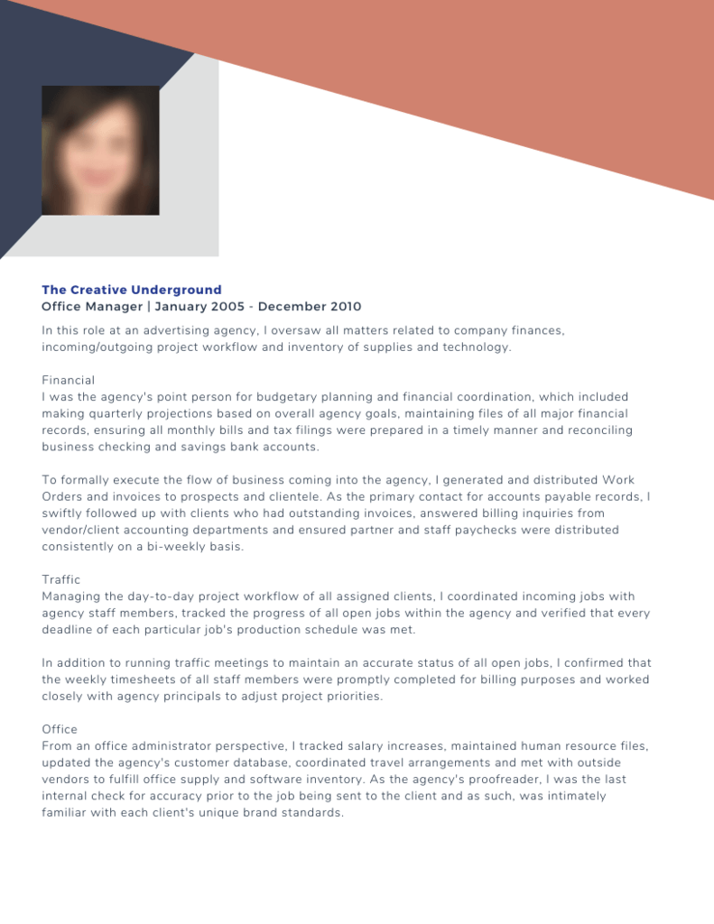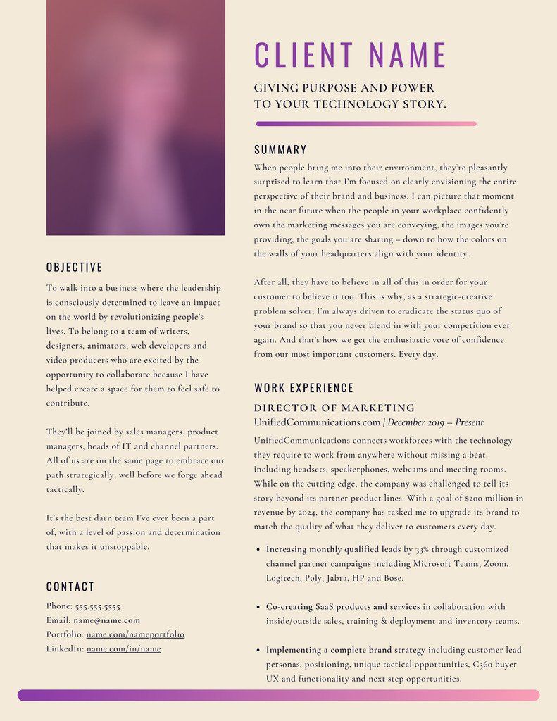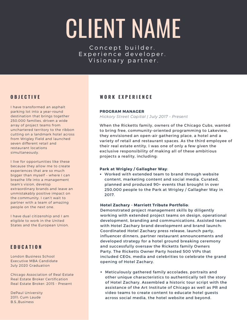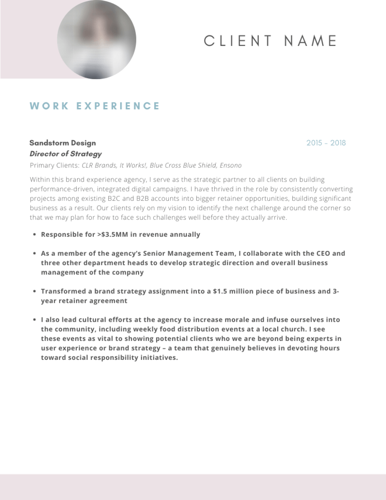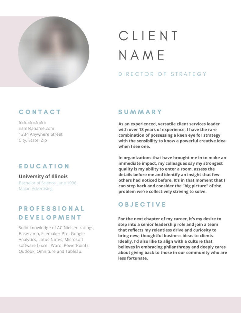 We thought so. That’s why we included a full-color design PDF resume in our offering to supply you with the most robust personal brand possible, especially when you add on the nifty fix-up and optimization coming your way via your LinkedIn Profile. Let’s recap: A better text resume. AND a graphic design resume. AND an optimized LinkedIn Profile.